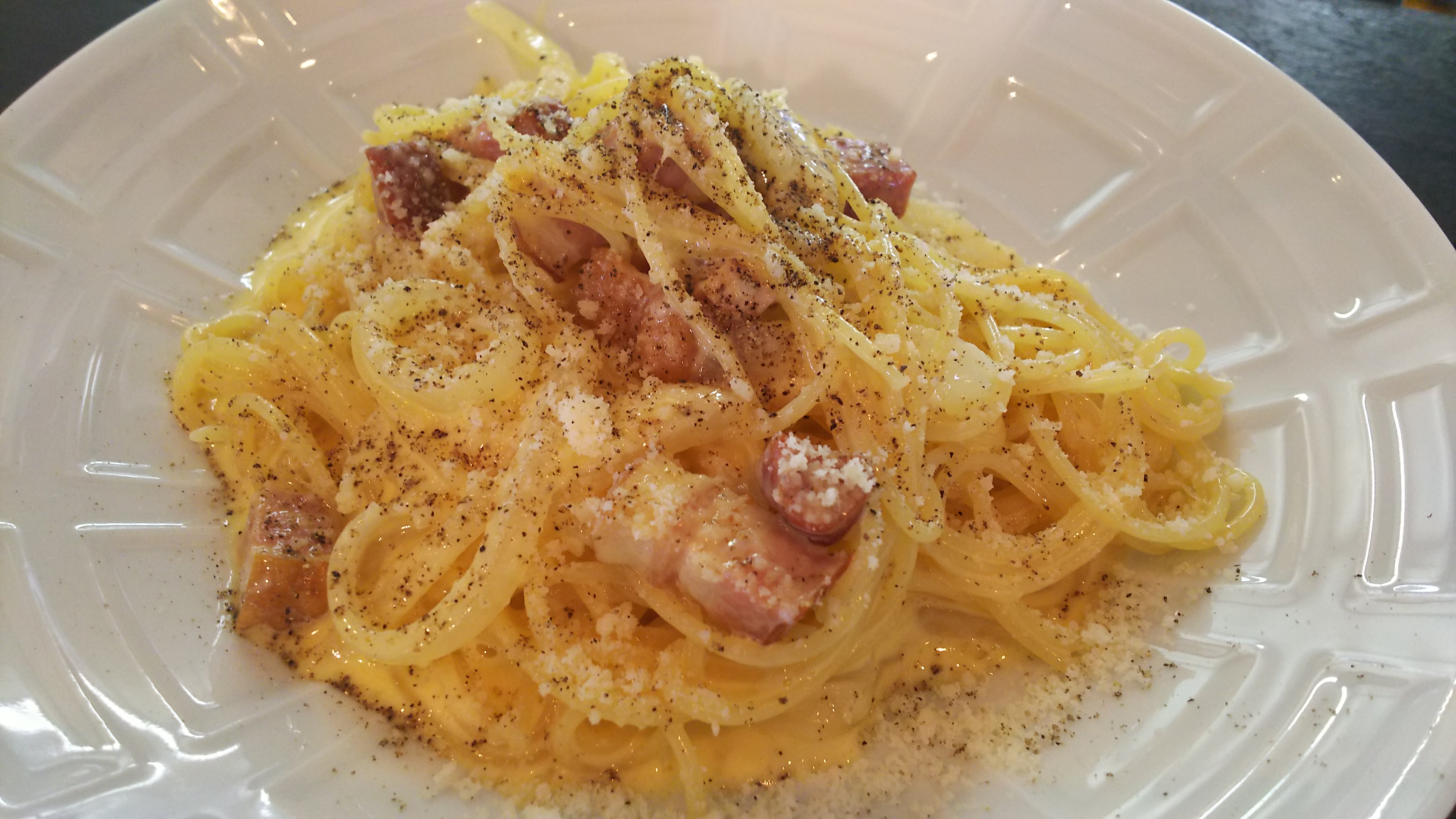 ・新玉ねぎのカルボナーラ、たっぷり黒胡椒仕上げ