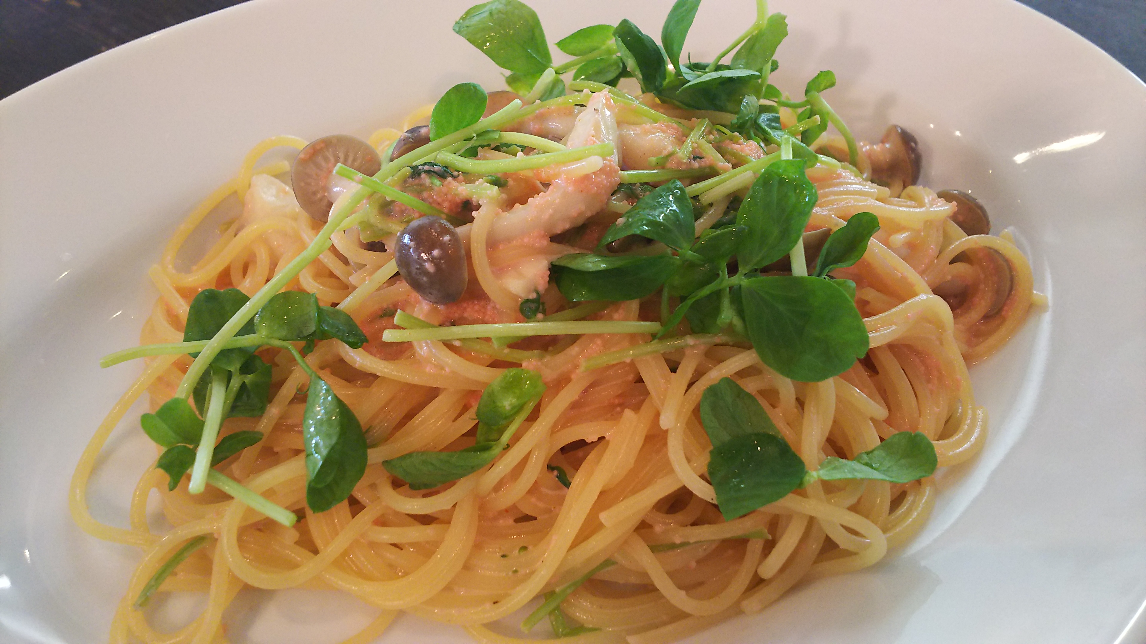 ・きのこと豆苗の明太子ソース