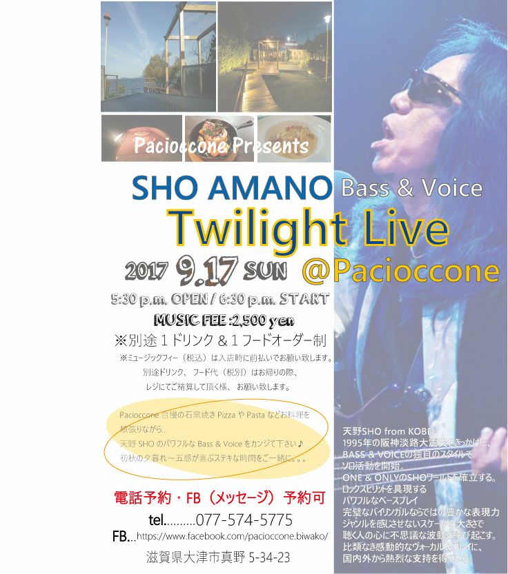 初秋のトワイライトタイム、SHOさんのパワフルなベース&ヴォイス、そしてPacioccone自慢のお料理を頬張りながら…五感が喜ぶ素敵な時間を過ごしませんか~♪