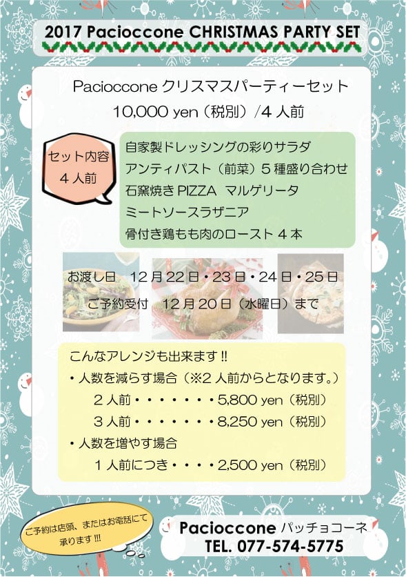 クリスマス持ち帰りメニュー 投稿日: 2017年12月3日2018年11月21日 投稿者: macky 今年、Paciocconeではご自宅等でお楽しみに頂ける様、「Christmas Party Set」をご用意致しました⤴️⤴️⤴️ ご予約、お待ちしております持ち帰りピッツァ各種ご用意しております。共有:クリックして Twitter で共有 (新しいウィンドウで開きます)Facebook で共有するにはクリックしてください (新しいウィンドウで開きます)